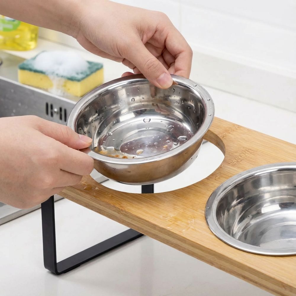 Die Edelstahlschalen des ErgoWood Doppelnapf sind vollständig herausnehmbar und spülmaschinenfest – ideal für eine schnelle und gründliche Reinigung.